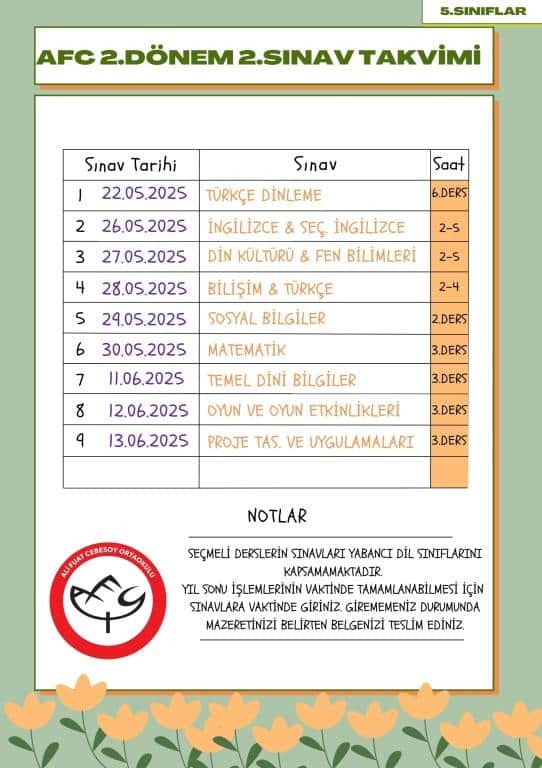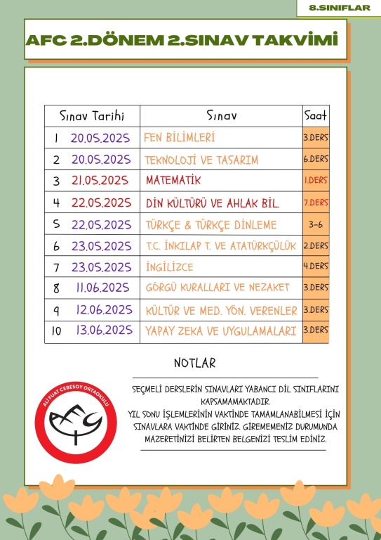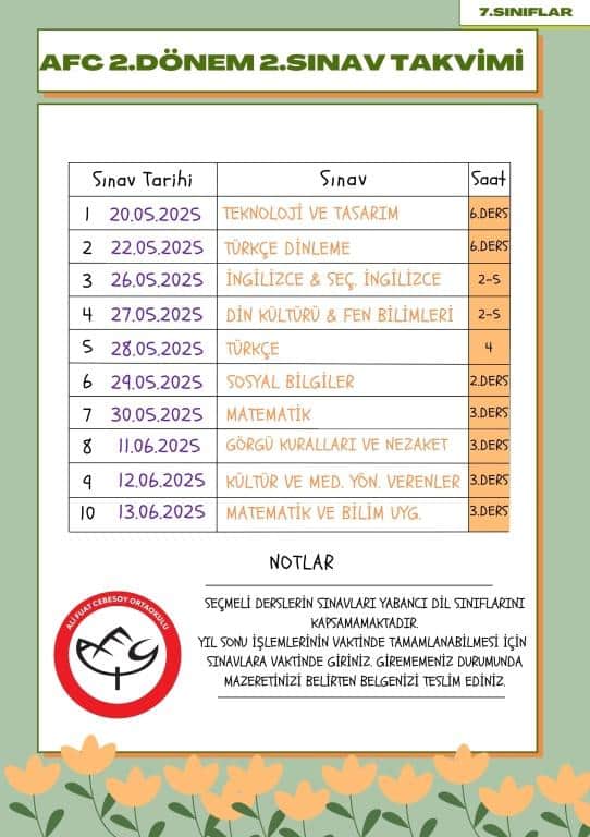 2024 - 2025 Eğitim Öğretim Yılı 2.Dönem 2.Yazılı Tarihleri